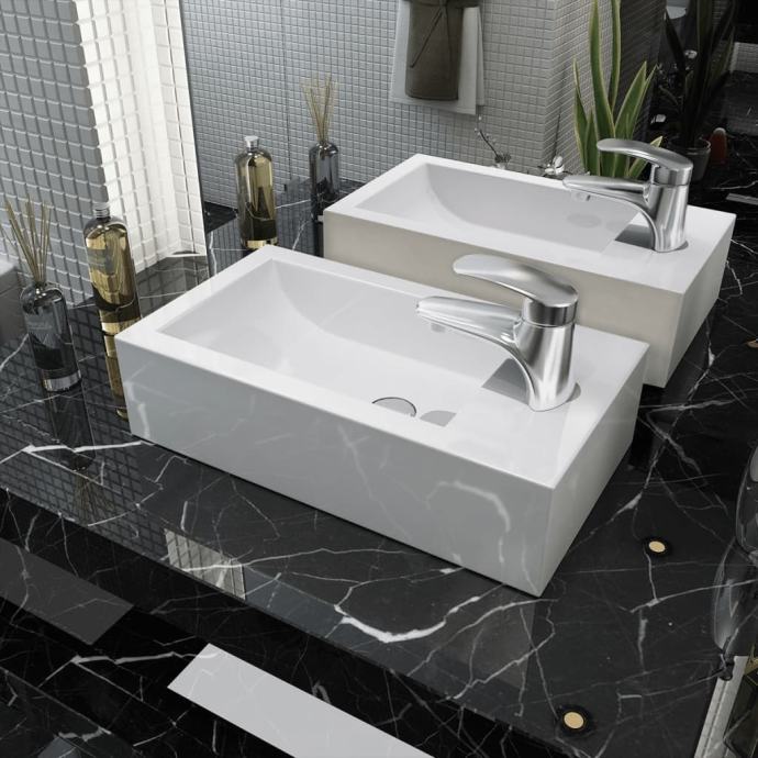 Ta pravokotni umivalnik iz premium keramike bo odličen stilski dodatek za vsako kopalnico, umivalnico ali toaleto. Glazirana površina umivalniku dodaja sodoben in eleganten značaj. Ta umetniški umivalnik ni samo praktičen umivalnik za vsakdanjo uporabo, saj je tudi prelep okras za vaš dom. Vsekakor se bo prilegal vsakemu slogu. Poleg tega je umivalnik precej preprost za čiščenje. Umivalnik ima odprtino premera 3,7-3,8 cm, ki je namenjena namestitvi pipe. Premer odprtine za odtok je 4,5 cm. Prosimo vedite, da pipa in odtok nista priložena.