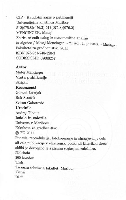 Matej Mencinger: Zbirka rešenih nalog iz matematične analize in algebr