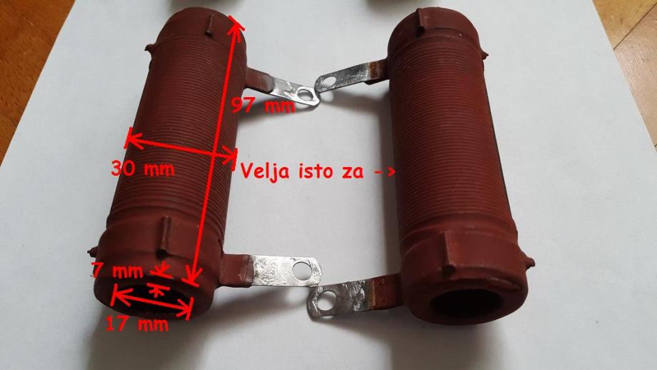 Prodam dva 30 ohmska 50 W Iskrina večja upora in dva Iskrina 7 ohmska 0,04 mH induktorja. Vse je staro sigurno (več kot) 20 let in se mi realno kot novo, nerabljeno valja že nekaj časa v predalu v delavnici. Začuda imajo še vsi v bistvu popolnoma ohranjene vrednosti (testirani na ustrezni napravi pač; Slike 10 – 13). Zadeva ima praktično torej že zgodovinsko vrednost (poleg funkcionalne). Dimenzije uporov in induktorjev so vrisane v Sliki 8 in 9 v oglasu. Cena/kos je okvirno 5 €, ob nakupu vsaj dveh istovrstnih reči primaknem tudi kak popust. Komponente že čakajo na svoje nove lastnike.