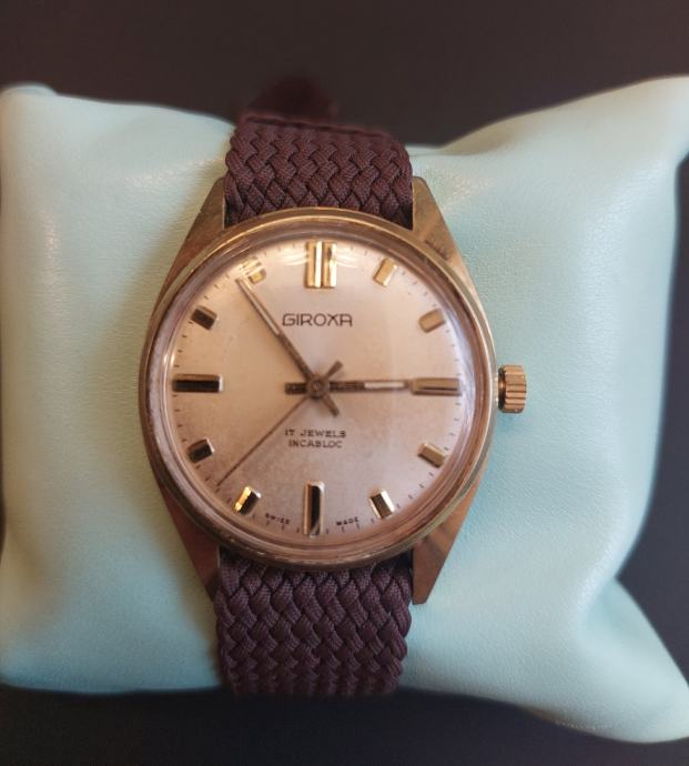 Stara ura Giroxa, narejen servis, menjano steklo, navojna krona in pašček...delujoča...pozlačena 10 micr.