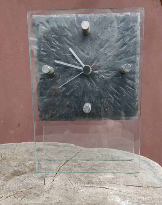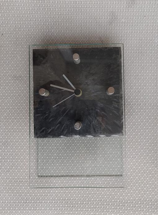 Prodam namizno dekorativno uro iz kovanega železa in stekla. Izdelek umetnega kovaštva iz Krope. Dimenzija ure je 14x21 cm (steklo) in 14x14 (samo kovani del). Leto izdelave 90. leta prejšnjega stoletja.