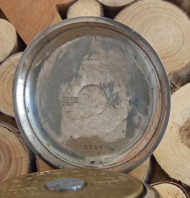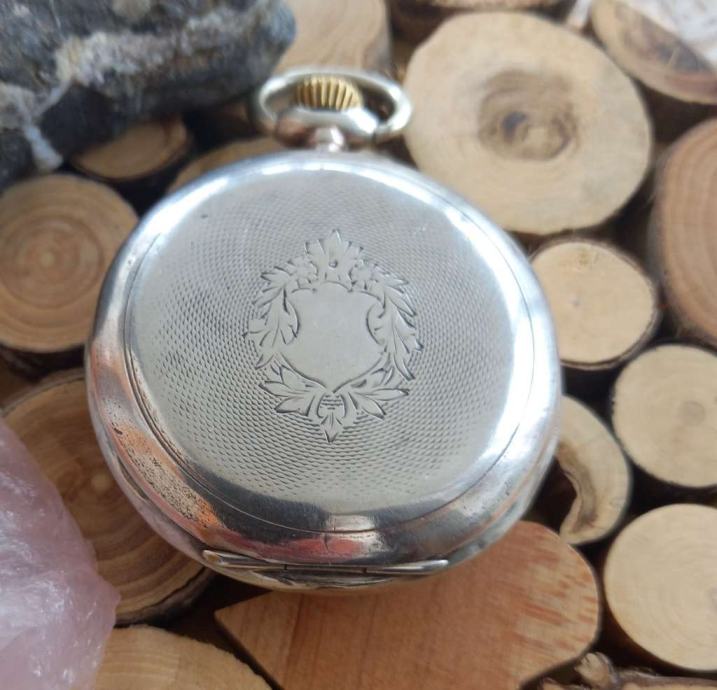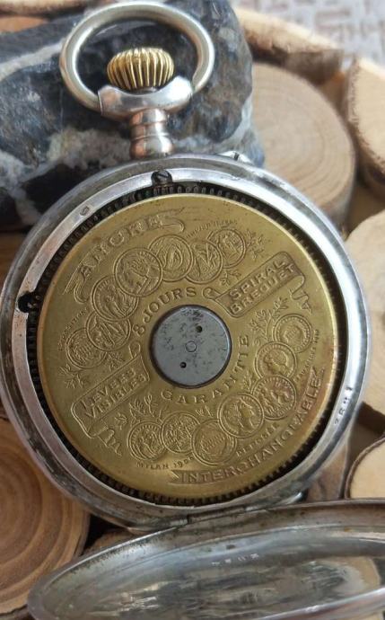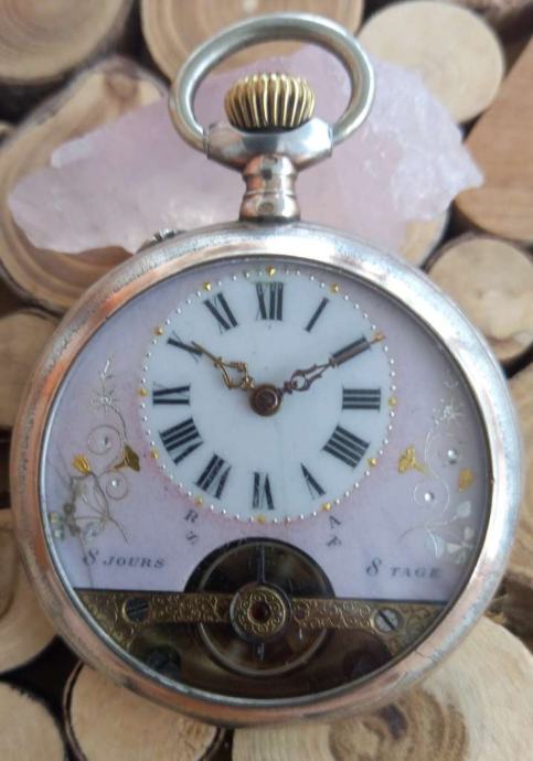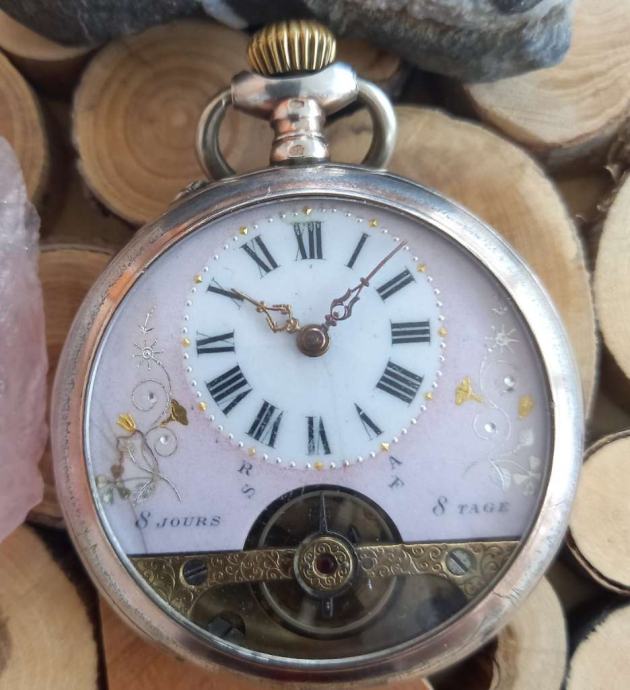 Švicarska 8-dnevna žepna ura iz začetka 20. stoletja . Osemdnevni mehanizem brez ključa Hebdomas ima veliko ohišje, ki pokriva zadnjo stran ure, in je označeno z "8 Jours Ancre – Spiral Breguet Levees Visible – Swis