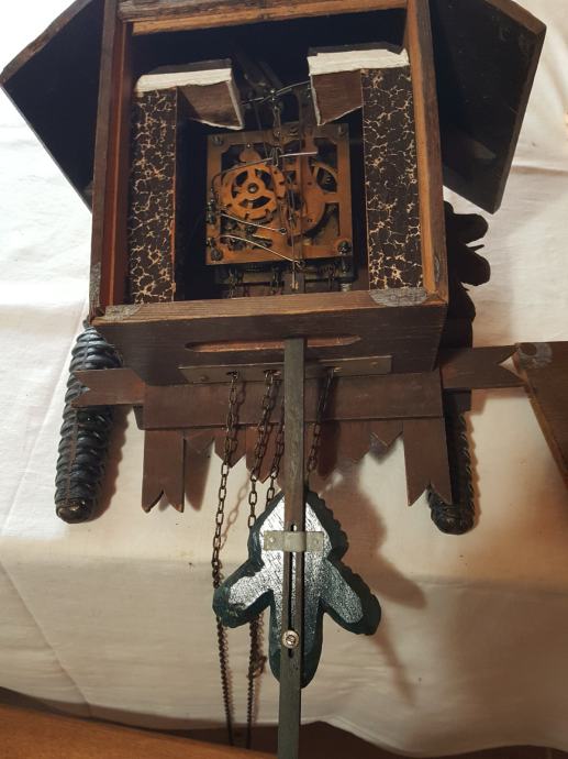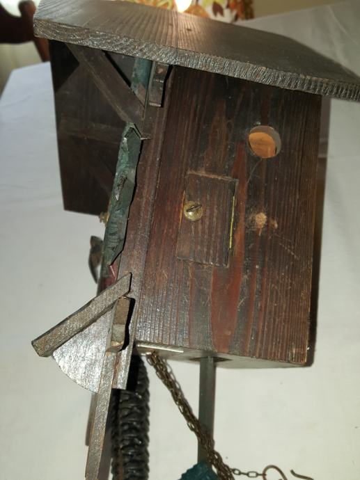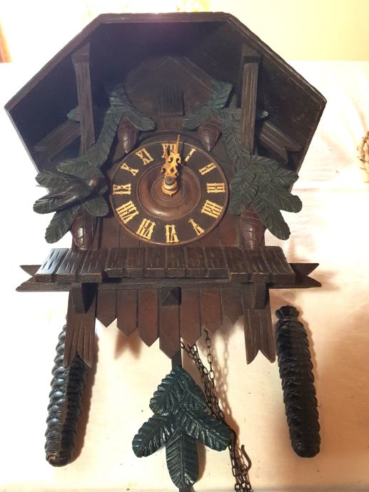 Stara večja kukavica v obliki brunarice, ročno rezljana, delujoča. Hiša je okrašena s smrekovimi vejicami s storži, na eni vejici je ptiček.