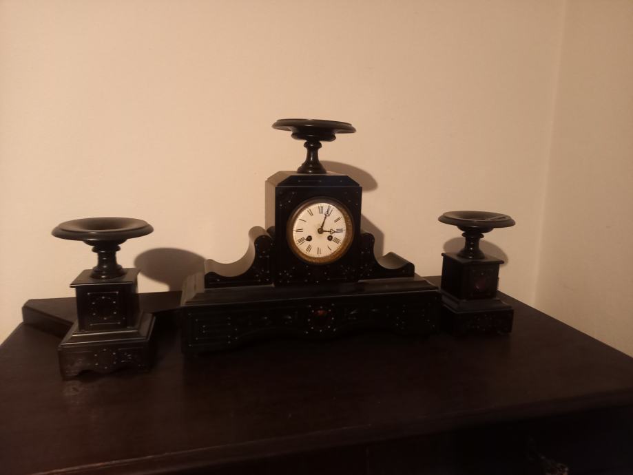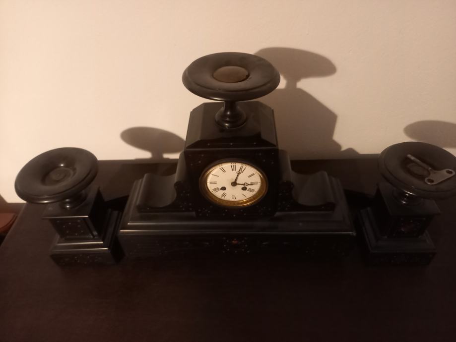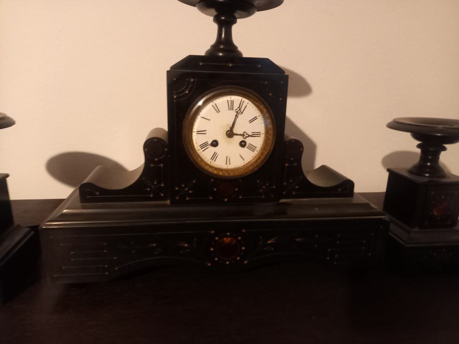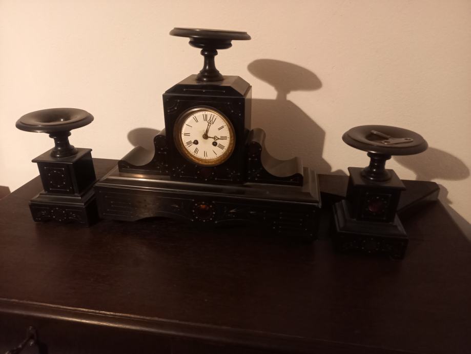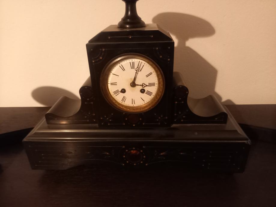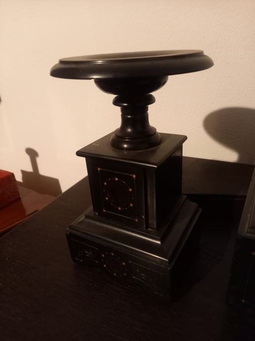 Prodam delujočo staro francosko kaminsko uro 19. stoletje z dvema pokaloma . Ura je dobro ohranjena.Bije ob pol in vsako polno uro. Mere ure: 14 x 45 cm,višina 39 cm, mere pokala: 10 x 13 cm,višina 23 cm. tel. 040 843 256