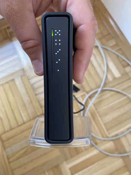 V kompletu je ruter, napajalnik kabel in podstavek za stoječo postavitev.
