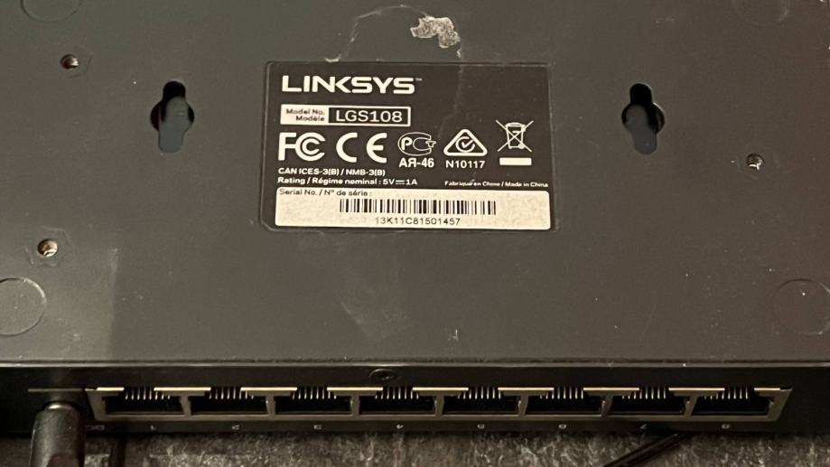 -Linksys LGS108: 8-portni gigabitni switch, primeren za hitro omrežno povezovanje v domačem ali pisarniškem okolju.