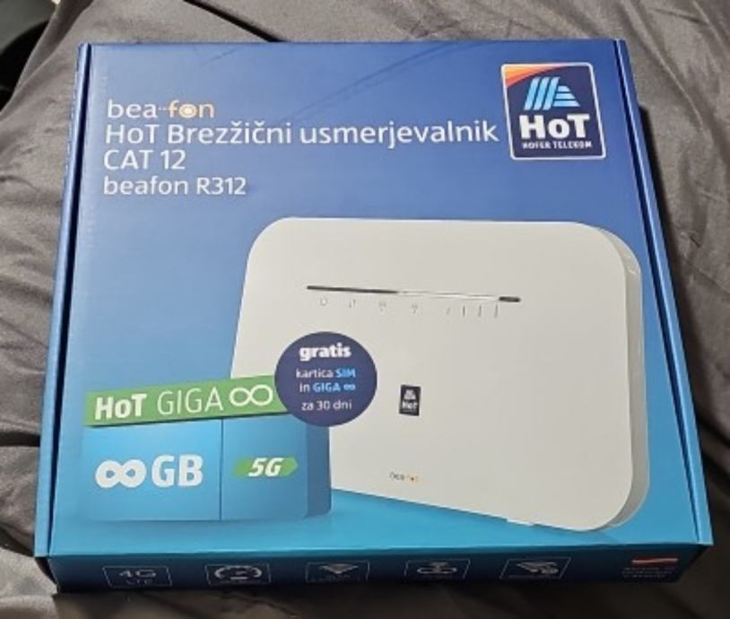 Prodajam povsem nov brezžični usmerjevalnik beafon HoT CAT 12 R312 s 5G tehnologijo. Naprava podpira 4G LTE omrežje in vključuje brezplačno SIM kartico s podatki za 30 dni. Idealen za hitro in zanesljivo internetno povezavo v vašem domu ali pisarni.
