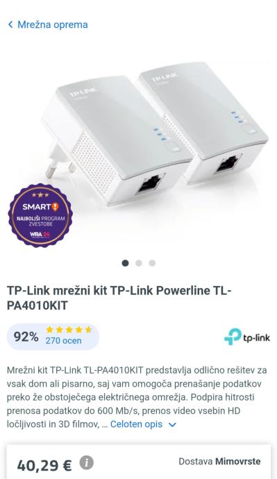 Prodajam zelo malo rabljen PLC adapter TP-Link AV600, ki je bil kupljen na mimovrste. Zraven je še celotna originalna embalaža.