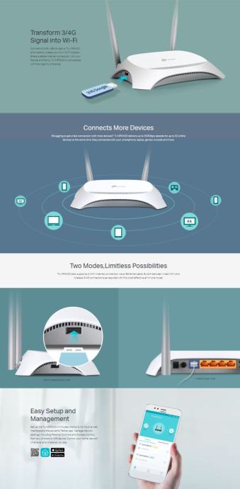 NOVO - TP LINK ruter Wi-Fi - ( Brezžični WLAN + 4G LTE ) - WiFi usmerjevalnik - ( Možnost priključka UMTS/HSPA/EVDO USB kartice za vzpostavitev omrežja 3G/3,75G preko SIM kartice ) ...