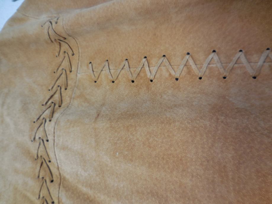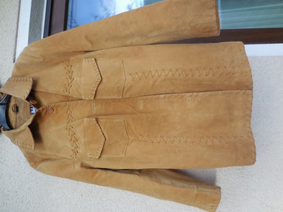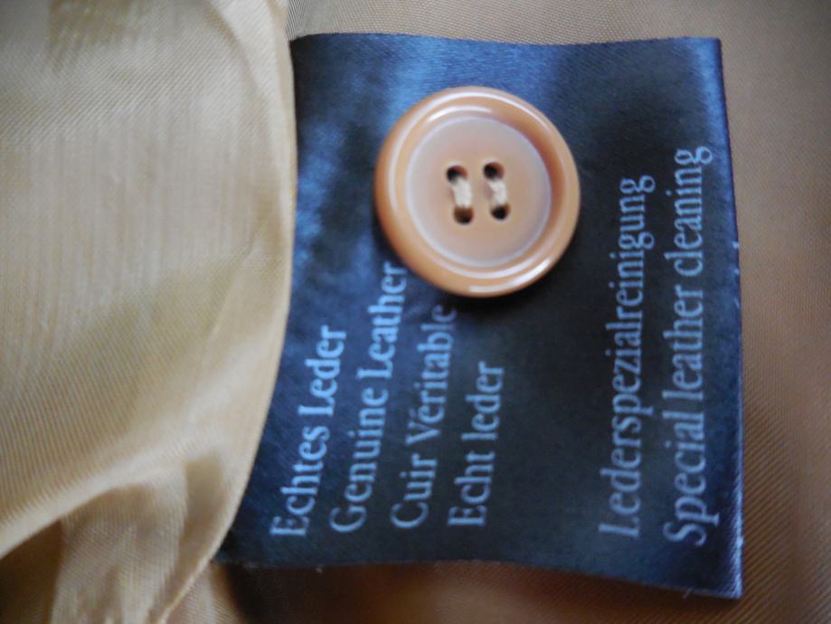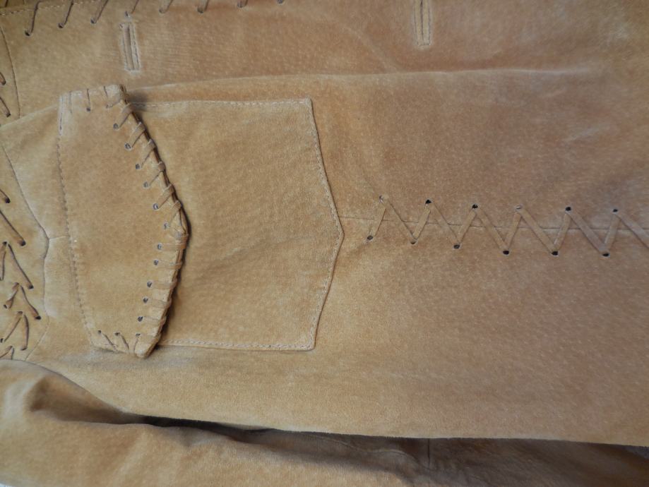 Izredno lepo ohranjena jakna iz pravega usnja, brez kakršnihkoli znakov nošenja. Je podložena, na sprednji strani ima 2 žepa. Ob ovratniku, na gumbnici, rokavih ter žepih ter na hrbtni strani ima po vsej dolžini vpletene tanke trakove usnja (kot vezalke).