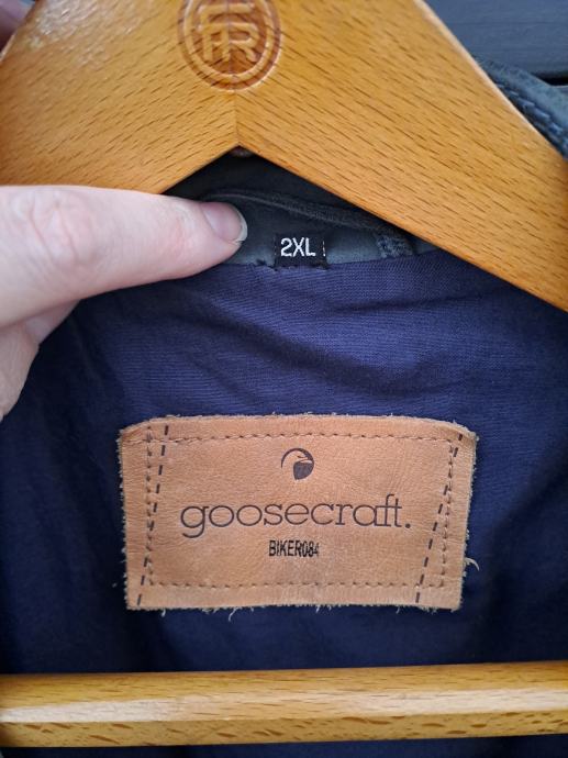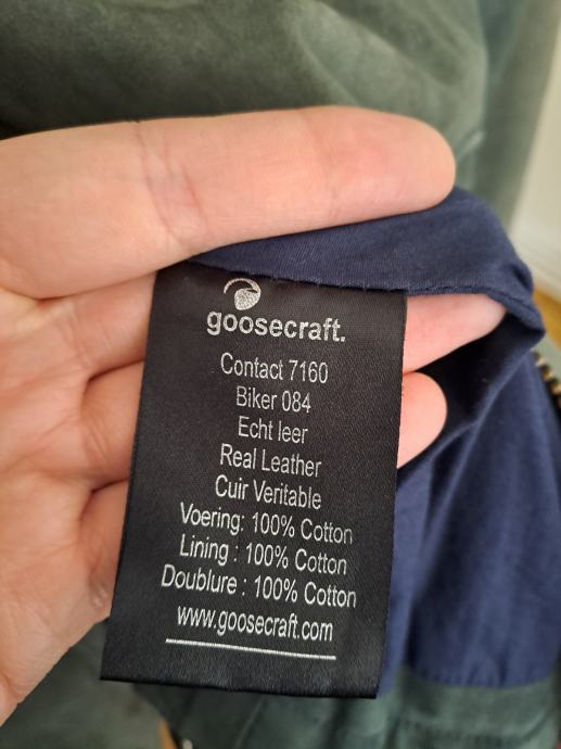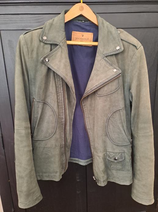 Podarim rabljeno zeleno usnjeno jakno znamke Goosecraft v velikosti XL. Jakna je iz semiš materiala in primerna za moške.