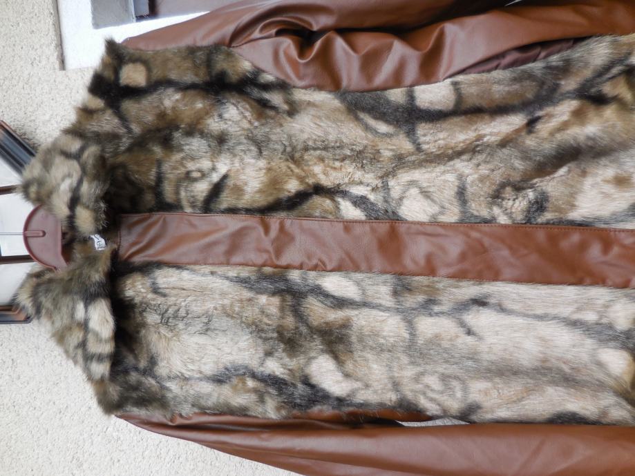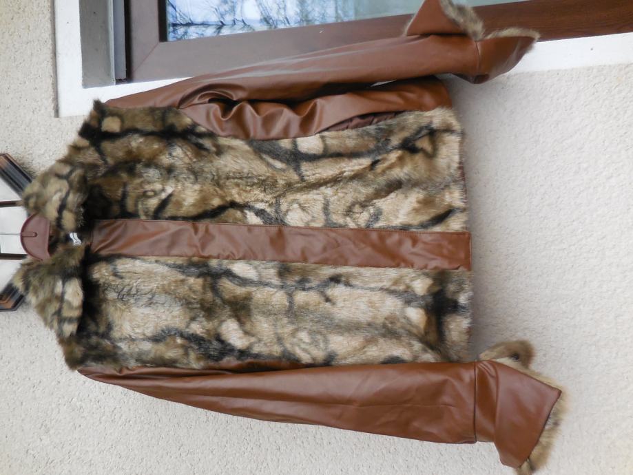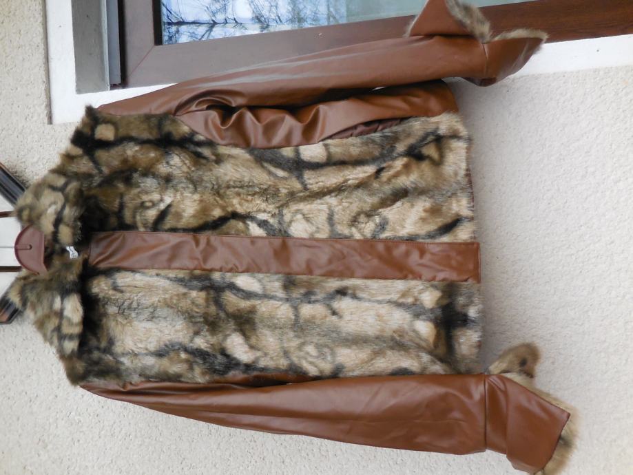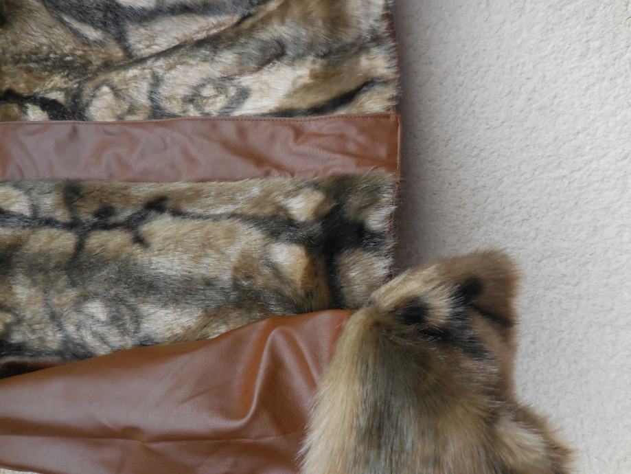 Nova, nikoli nošena kratka jakna živalskega vzorca iz umetnega usnja in umetnega krzna. Jakna se zapenja na netke, je podložena in ni raztegljiva.