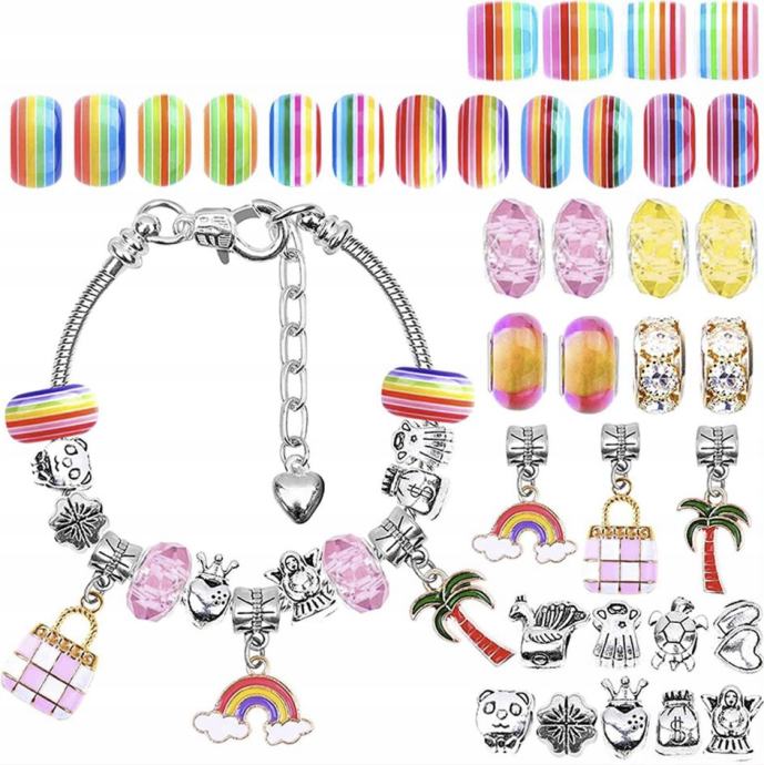 KOMPLET NAKITA – ta unikaten komplet bo zagotovo všeč vsaki deklici, ki ima rada nakit. V kompletu je veliko pravljično pisanih obeskov različnih oblik in barv. Zahvaljujoč njim lahko otrok to naredi na svojih okraskih , zapestnicah ali verižicah , ki jih bo podaril nekomu od svojih bližnjih ali jih bo nosil sam.
