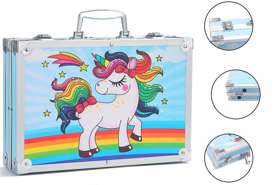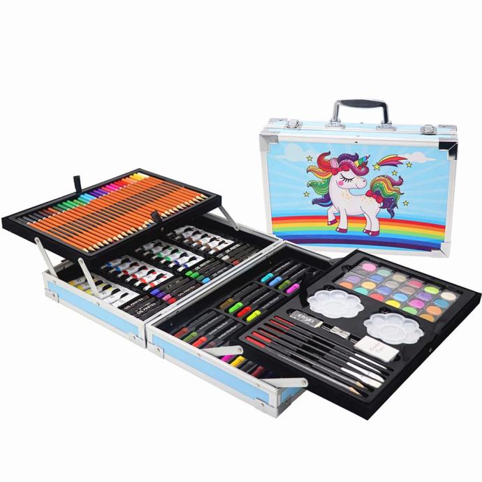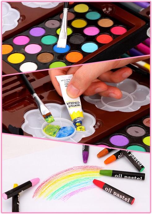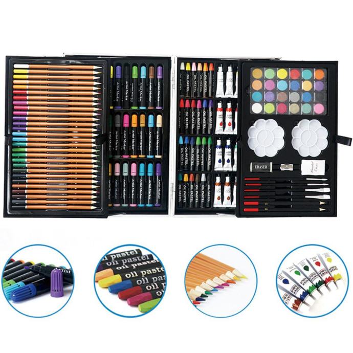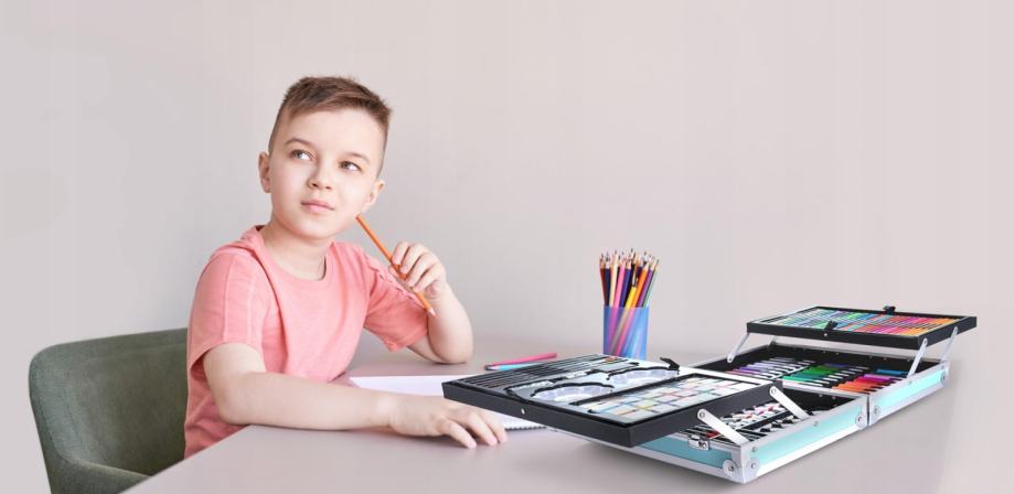 V našem umetniškem kompletu je za vsakogar nekaj – barvna pisala, barvice za risanje in barveza slikanje . Vse to v najčenih barvah , ki izgledajo odlično na papirju. Vse je zaprto v udobnem kovčku , ki ga je mogoče preprosto zložiti, zapreti in vzeti s seboj – v šolo , vrtec, likovne ure ali na izlet slikat na prostam!