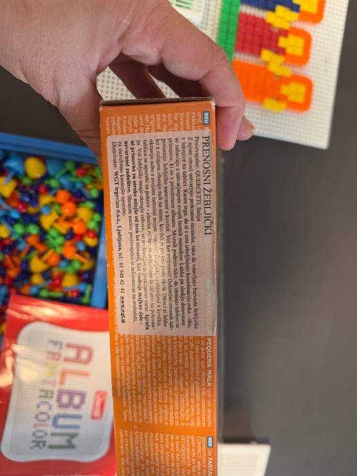 Barvasti žebljičkii za mozaike. Barvasti žebljički se vstavljajo v luknjice na tablici. Priložen je album z idejami. Dodatne plošče in dodatni žebljički iz drugega seta.