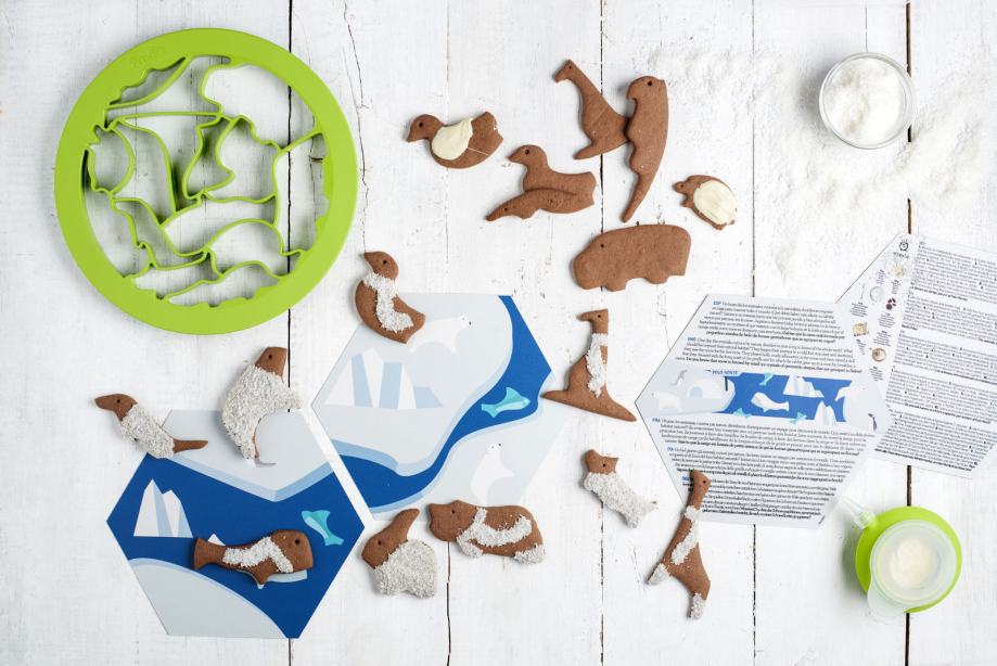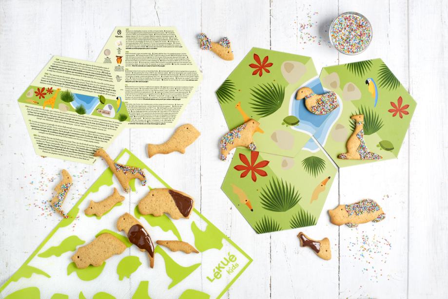 Komplet vključuje:- 1 model za piškote živali okoli sveta- 1 Decopen- 1 podloga za peko Lékué Kids- 4 igralne plošče in scenariji za igro- 4 recepti