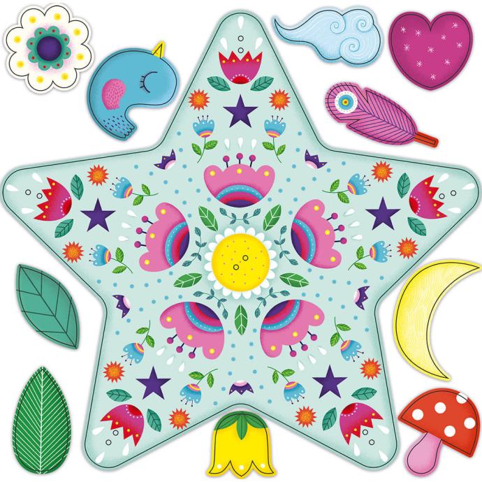 Otroški ustvarjalni set za izdelavo prečudovitega okraska za obešanje vsebuje 1 zvezdo iz debelega papirja, 15 vil iz papirja, ki so že izrezane, 1 komplet nalepk, 1 komplet bleščic, 5 barvnih niti, 1 zlato nit in knjižico z navodili.