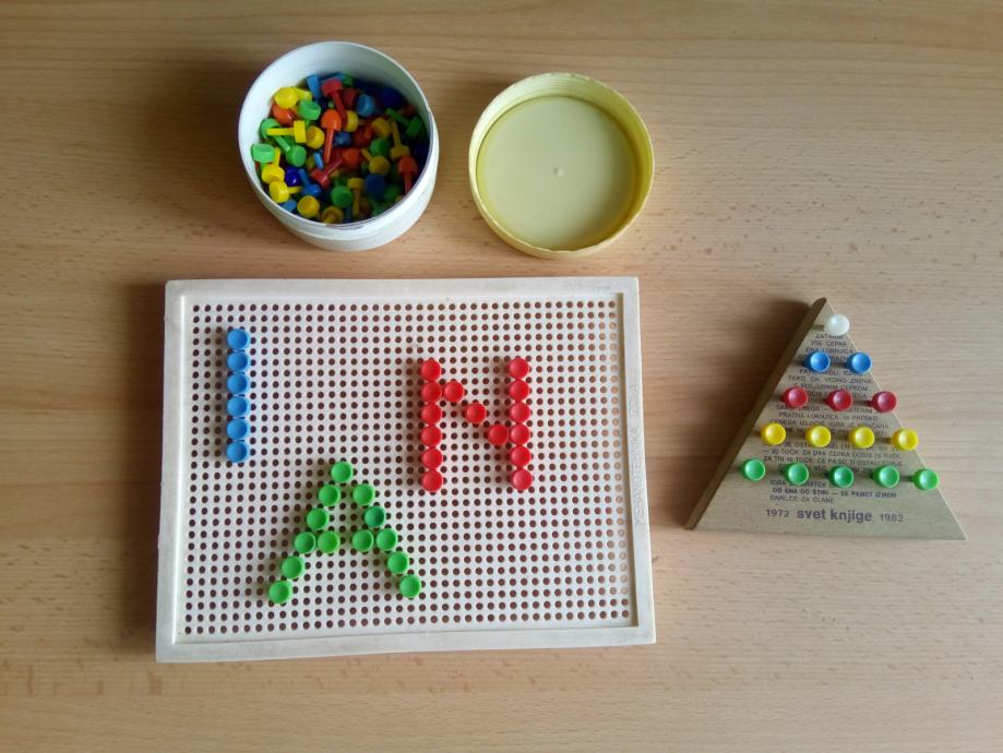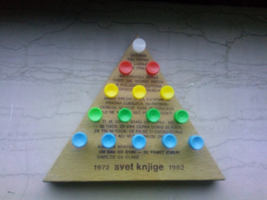 Trikotnik vel. 13 x 13 cm pa je igrica z žebljički za kratek čas za vso družino.