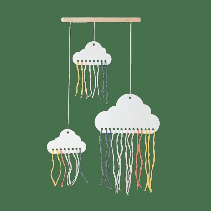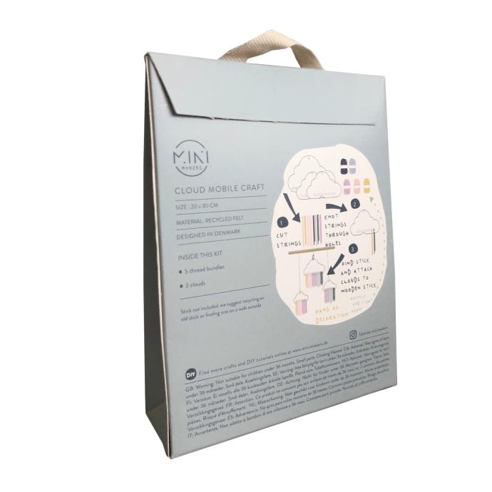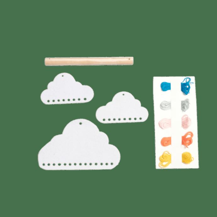 Z DIY ustvarjalnim setom za izdelavo mobile otrok ustvarja lasten okrasek za otroško sobico. Zbirka materialov je pripravljena tako, da lahko otrok sam okrasi oblačke z mavričnimi nitkami in jih obesi na leseno palico. Palica ni priložena, predlagamo da jo poiščete na sprehodu.