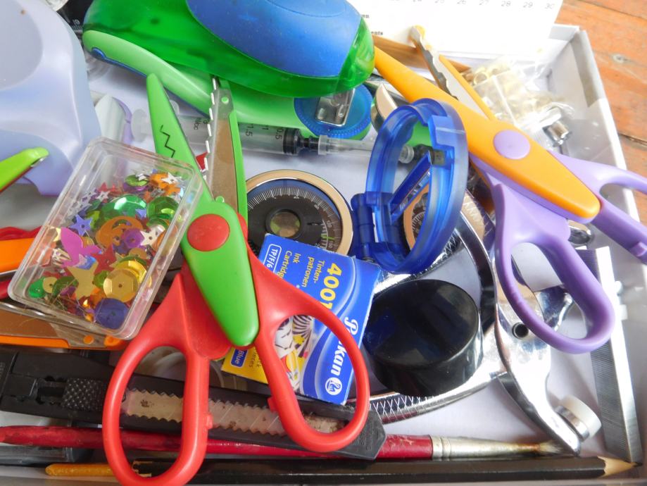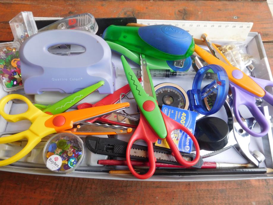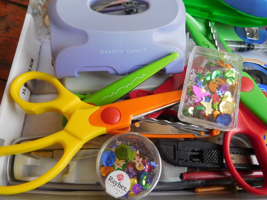 Notri je kompas, različne oblikovne škarje, luknjači, spenjalniki, pripomočki za nete... zraven dodam karton formata 22 x 22 cm 300 kom.