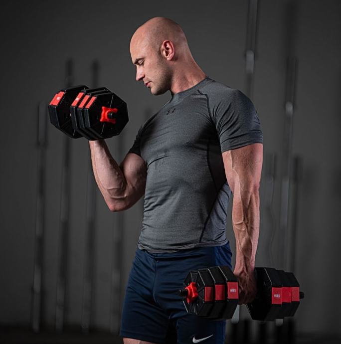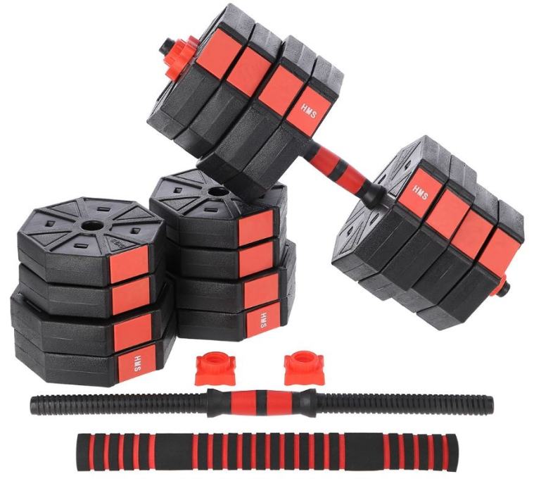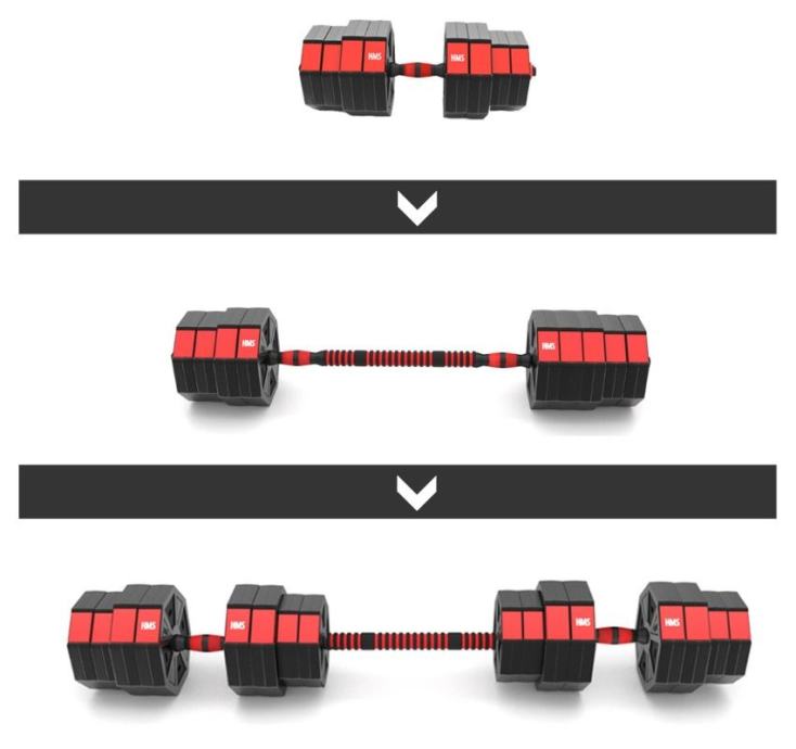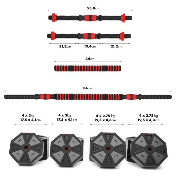 Komplet uteži 40 kg, ki jih lahko sestavljamo med seboj. Kakovostni material zagotavlja visoko trpežnost. Diski so prekriti s PVC materialom, ki ga dodatno zaščiti. Objemke in odlično ujemajoči premer luknje za disk omogočajo hitro menjavo uteži. Objemke so navojne, vendar imajo dodatno ojačitev zato se obremenitev med vadbo ne premika. Dve kratki palici lahko združimo v eno dolgo. Ta inovativna rešitev znatno razširi možnosti vadbe.