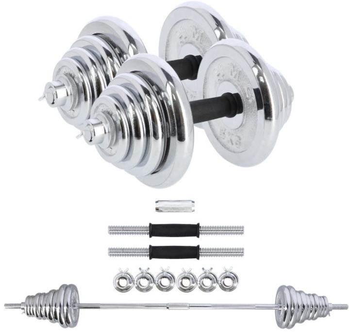 Celoten set uteži v kovčku skupne teže 50 kg. Kovček lahko premikate s pomočjo vgrajenih kolesc. Dve palici skupaj povežete v eno dolgo.