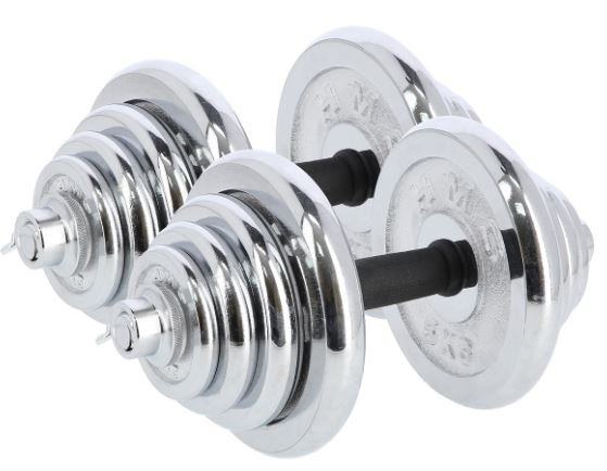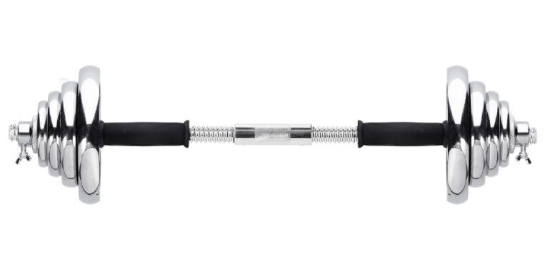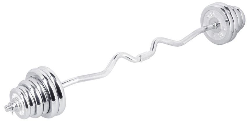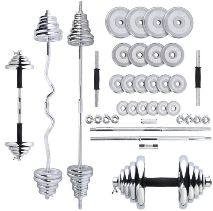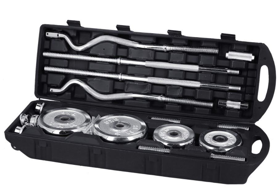 Celoten set uteži v kovčku skupne teže cca 55 kg. Set ima vključen poleg ravnega droga tudi ukrivljen drog, kratek drog ter podaljšek za združitev drogov. Visokokakovostno kromirano jeklo zagotavlja visoko vzdržljivost in s tem možnost dolgoletne uporabe. Objemke so navojne in imajo dodatno ojačitev v obliki zategnjenega vijaka. Zahvaljujoč temu se obremenitev med vadbo na noben način ne more premakniti. Kombinacija uteži s palicami omogoča celovit trening vsake mišične skupine.Material: kromirano jeklo,
