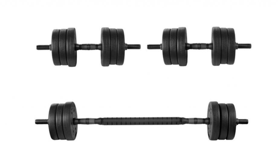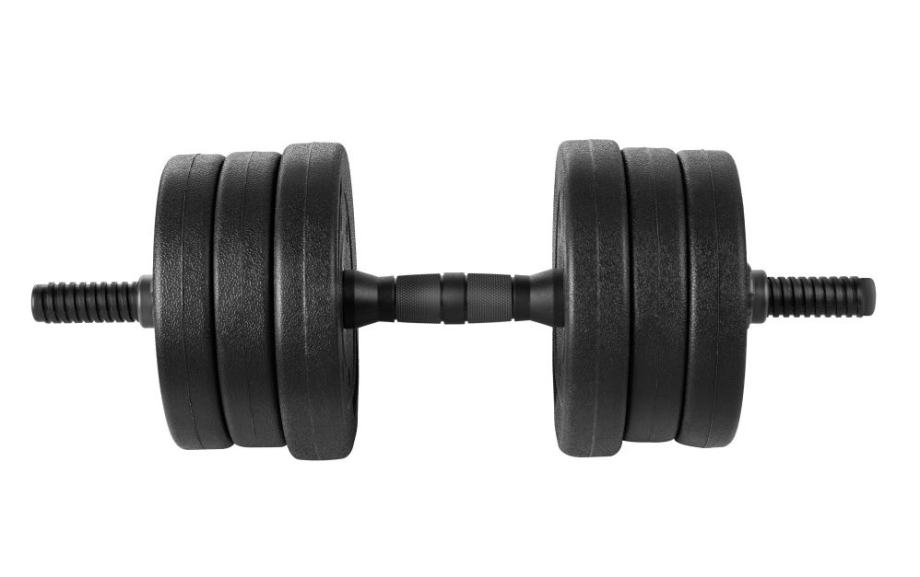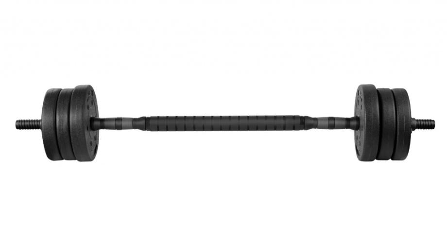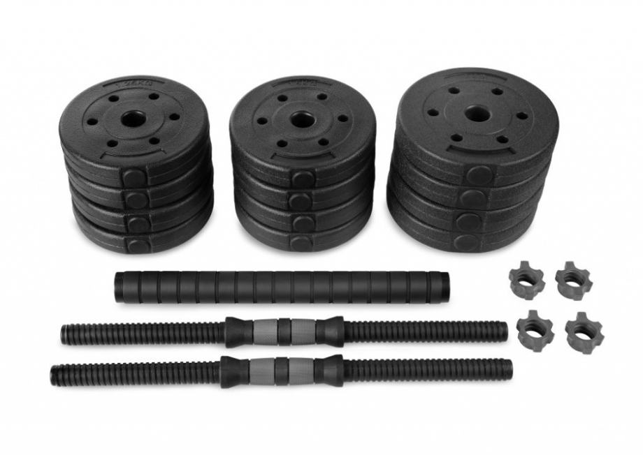 Iz kompleta lahko sestavimo 2x kratke ročke po 10 kg ali en dolgi drog s težo 20 kg. Cementni diski prekriti v trdno plastiko.