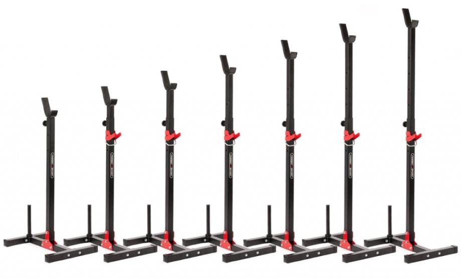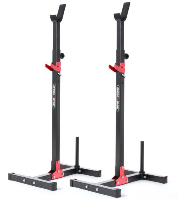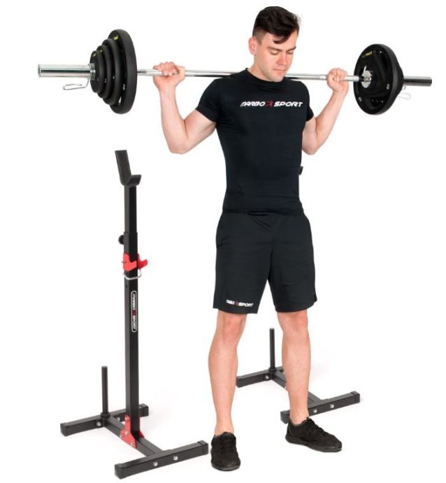 Fitnes stojalo za počepe z utežno palico ali kot naslon za palico pri bench press vadbi skupaj s klopjo. Nastavimo ga lahko na 7 višin, ki omogočajo zelo raznoliko usposabljanje mišičnih skupin. Utežno palico položimo na gumirano podlago, ki blažijo hrup in udarce med treningom. Profil 40 x 40 mm prenese do 250 kg teže. Dodatni varnostni nasloni, ki jih lahko nastavimo na višini od 66 do 76 cm. V spodnjem delu lahko odlagamo diske z luknjo premera 28 mm ali več. Velikost spodnjega dela 50 x 41 cm za 100% stabilnost stojal.