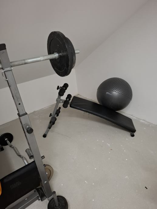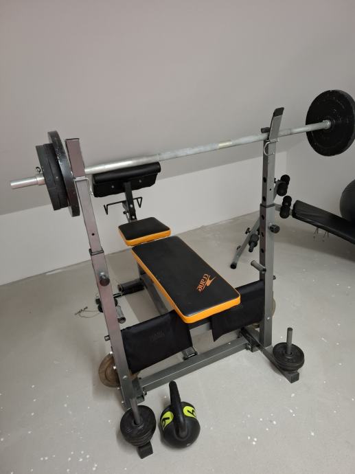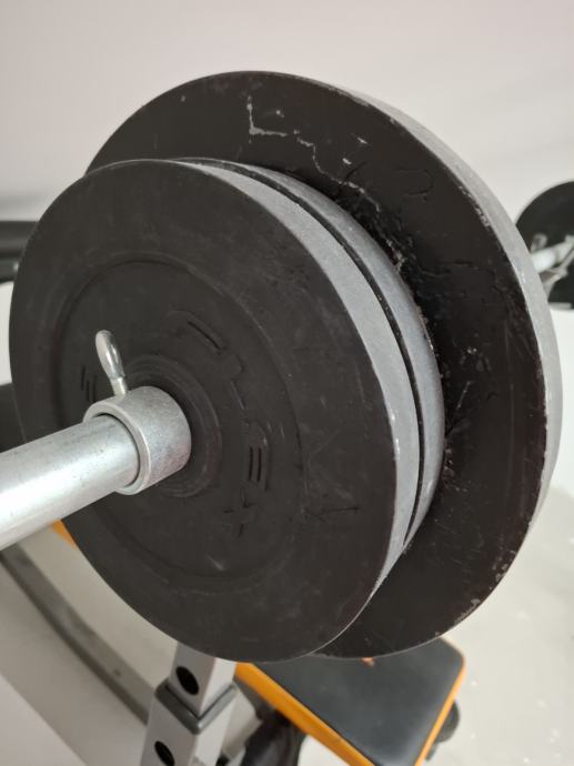 Zelo ohranjena ,brez poškodb, ravna palica in okrivljena palica in uteži in vadbena klop