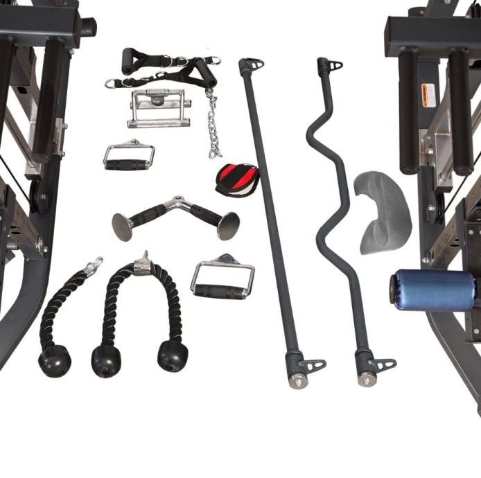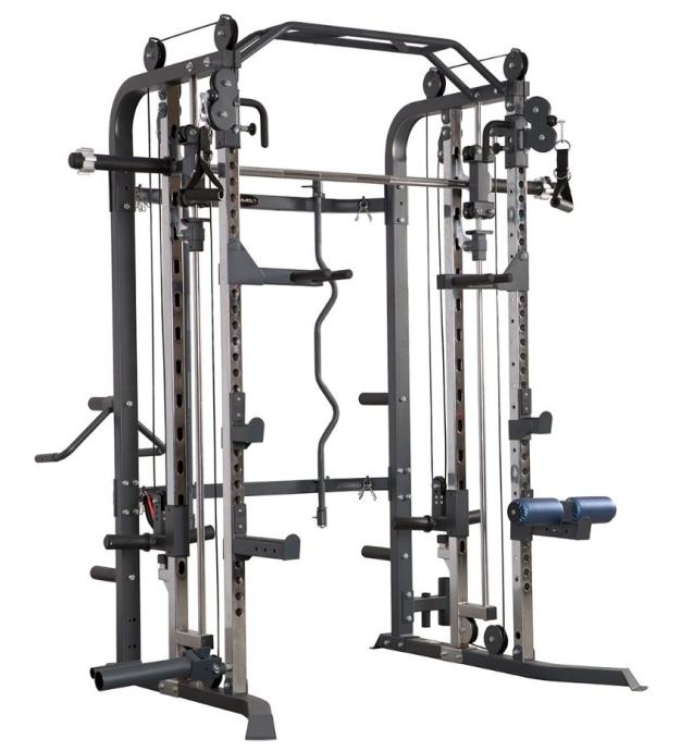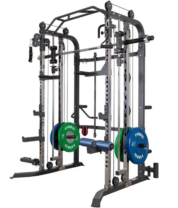 Multifunkcijska naprava je zasnovana za celovit trening celega telesa. Njena vsestranskost bo na enem mestu nadomestila številne naprave običajne telovadnice. Homegym CYKLOP 1 vključuje Smithovo palico s 14 višinami vadbe, zgornje/spodnje škripce, univerzalno palico, ravno in kotno os, adapter za vaje z olimpijsko osjo v kotu (os ni vključena v komplet), opore za sklece, kratke in dolge omejevalnike ter številne adapterje. nbsp;Kot obremenitev se uporabljajo plošče s premerom luknje 50 mm, ki jih je mogoče namestiti na 4 priložene trne (diski niso vključeni). Tako široka paleta opreme je idealen stroj za ljudi, ki razmišljajo o celovitem razvoju mišičnih skupin. Visoka kakovost naprave zagotavlja dolgotrajno brezhibno delovanje. Močni okvirji iz visokokakovostnega jekla, sistem škripcev in naprava za napenjanje vrvi izpolnjujejo najvišje tehnične in estetske standarde.