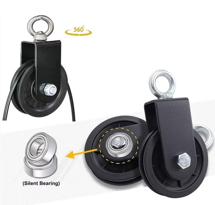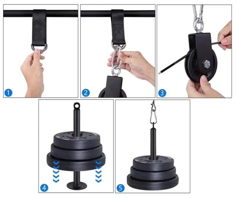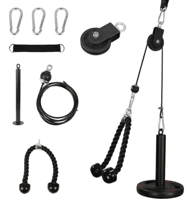 Komplet fitnes škripec za vleko uteži. Škripec lahko obesimo na katerikoli drog, kletko, dip napravo, samostoječi drog ali ga fiksiramo v strop. V kompletu prejmete škripec, jekleno zajlo, nosilec za diske, 3 karabine, pas ter ročaj za vadbo. Po želji lahko držalo menjate z drugimi. Naprava je narejena iz močnega jekla. Napravo lahko hitro pripravimo s pomočjo priloženega traku.