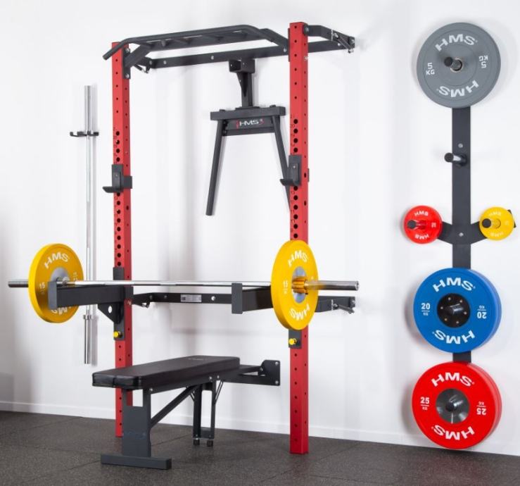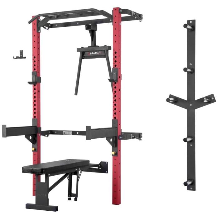 V tem kompletu prejmete še nosilec za fitnes drog, nosilec za diske, priključek za dip-se ter klop! nbsp;Ima 6 nosilcev za diske, ki prenesjo 1000 kg. Obesite lahko 2 dolgi fitnes palici. Klop lahko po uporabi zložite ob steno.