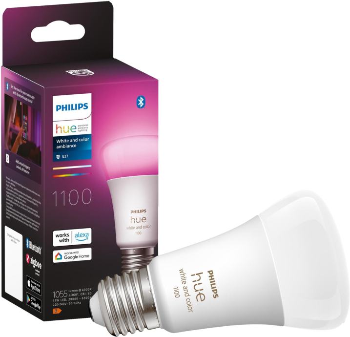 Enojno pakiranje Philips Hue White & Color Ambiance E27 800 lm 9 W vključuje razširitveno sijalko. Upravljanje je mogoče prek povezave Bluetooth in mosta. Sijalka sije v 16 milijonih barv in vseh odtenkih bele. Primerna je za vsako svetilko z okovom E27.