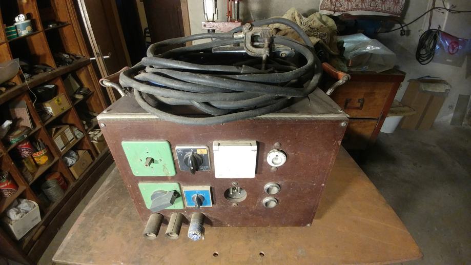 Masivni varilni aparat domače izdelave s pripadajočimi kabli