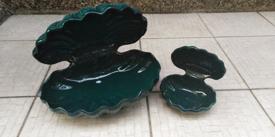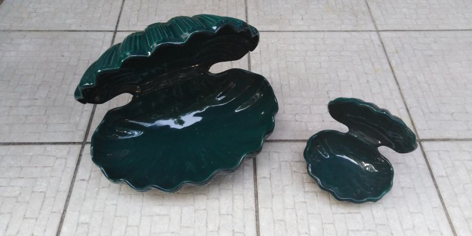 Prodam set dveh dekorativnih posod, v obliki odprte školjke, temno zelene barve. Večja školjka dim. D.33x V.30cm, manjša dim.D.15x V.18cm. Visoko kvalitetna keramika. Primerno za dekoracijo ali rastline.
