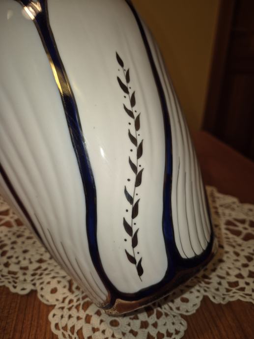 Vaza je bele barve z ročno poslikanimi modrimi in zlatimi detajli, primerna kot dekorativen kos ali za aranžmaje s suhim cvetjem.
