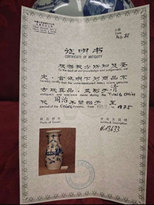 Kitajska vaza iz dinastije Ching s certifikatom. Višina 42 cm. 800/kos.