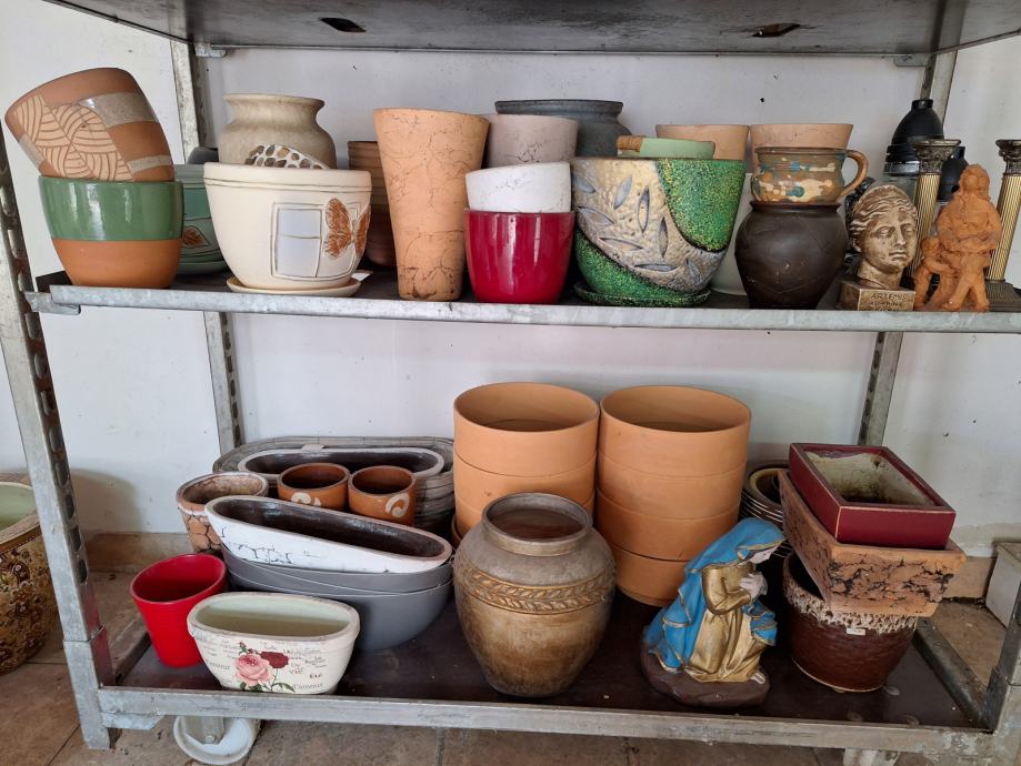 Prodam celoten komplet keramičnih in drugih izdelkov na stalaži. Komplet vsebuje večje število keramičnih loncev različnih velikosti, svečnik, kip,...