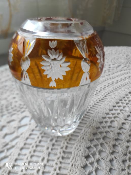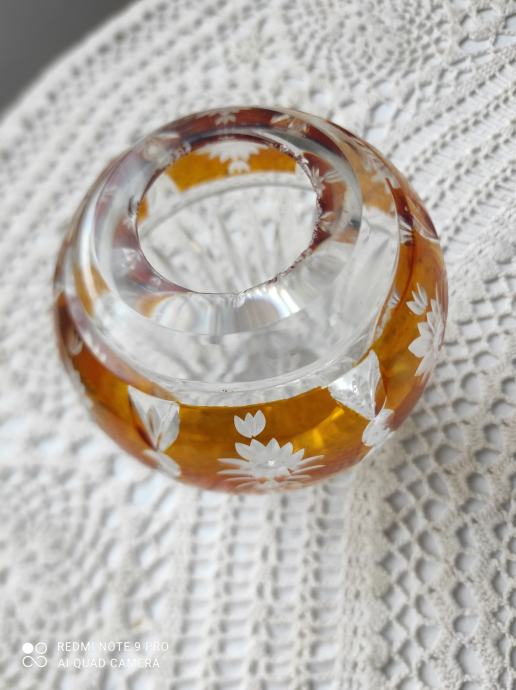 Kristalna brušena vaza ima žal plitko okrušen notranji rob odprtine,