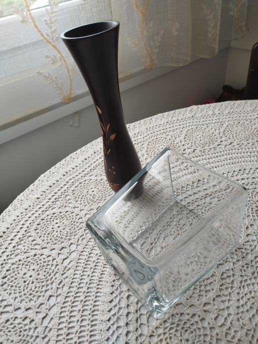 Lepa lesena izrezljana vaza, viš. 31 cm in steklena vaza, vel.14x14x17