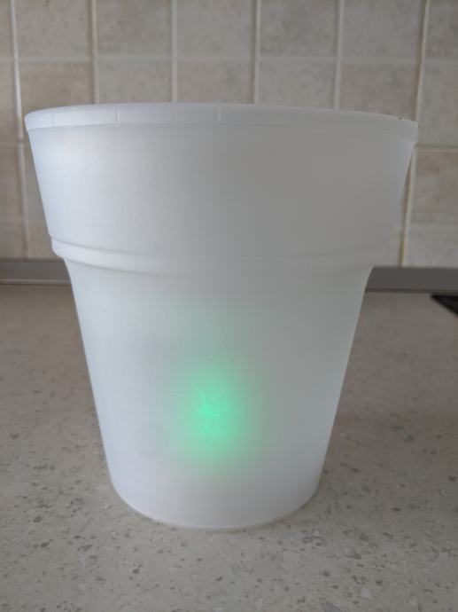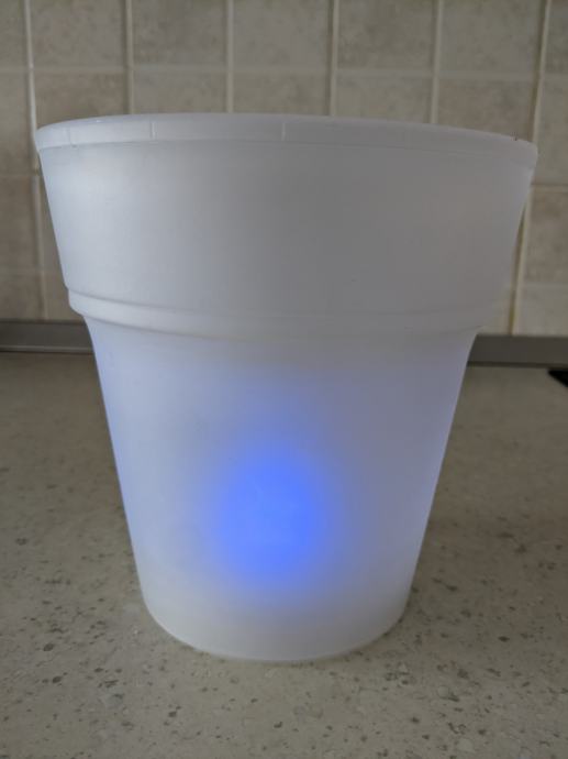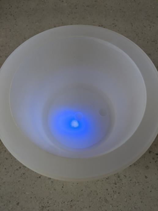 Lonček ima spodaj LED lučko ki spreminja barve: roza, modra, zelena