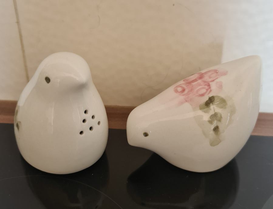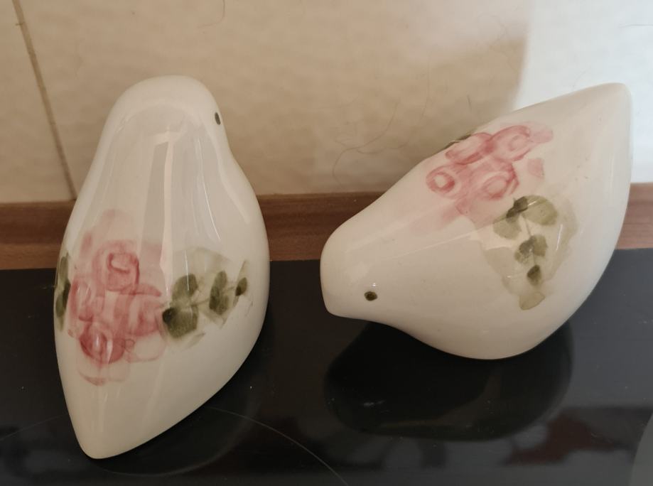 Prodam porcelanasto poprnico in solnico v obliki ptičkov, nikoli rabljeno. Primerno za darilo.