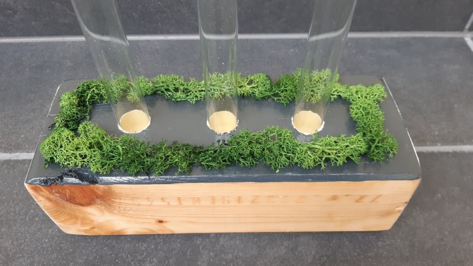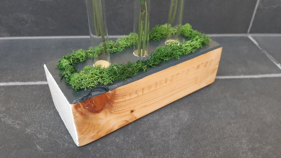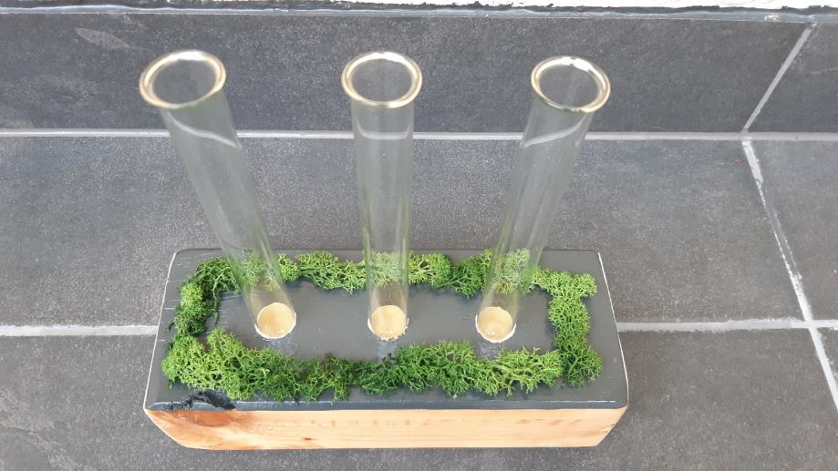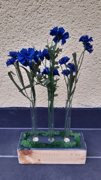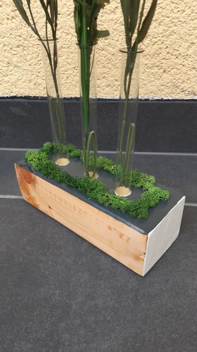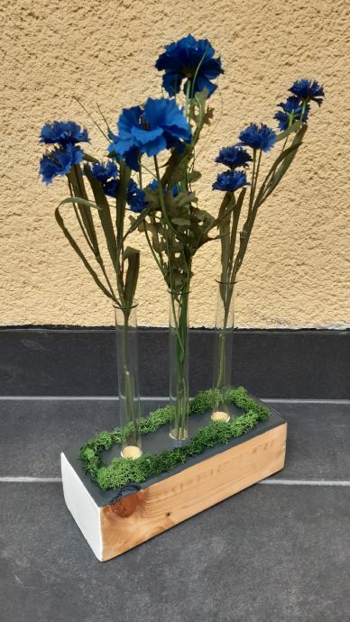 Prodam vazo,kombinacijo lesa in 3 steklenih vaz.Naprodaj je brez vijoličastih cvetov.Dimenzije:25×10×26 cm(DxŠxV).DIY projekt.Pošljem po ceniku Pošte Slovenije.