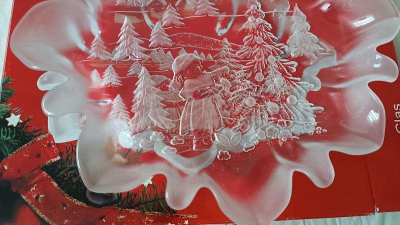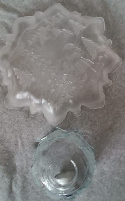 Prodamo nerabljeni dekorativni stekleni posodi za praznične zimske dni. En je večji svečnik ali za kaj drugega in en je pladenj za sladkarije ali kaj drugega. Oba imata enak motiv, narejena iz masivnega stekla, sta nerabljena in čista. Prodamo posamezno ali oboje skupaj. Cena: svečnik 7 EUR, pladenj 13 EUR ali oboje skupaj za 15 EUR. Prevzem Ljubljana- Vič, Rožna dolina, ne pošiljamo, ne menjamo, 040/854-637.