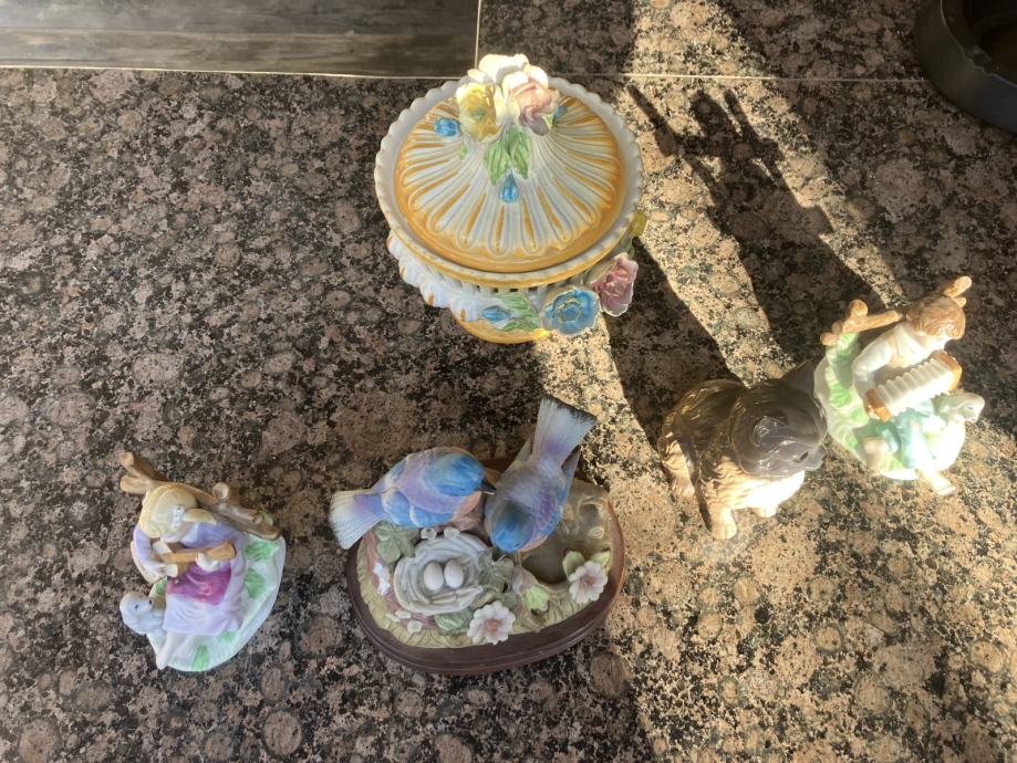 set petih kipov iz porcelana, kip z ptički je glazbena skrinjica z ročnim navijanjem, brez vidnih znakov obrabe, širina kipa ptičkov 24 cm