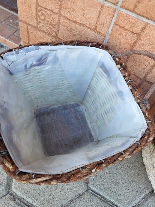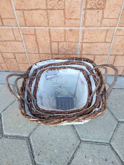 Prodam set košar za rože ali kaj drugega. Plastika v notranjosti je preparela, drugače so bile košare zelo malo uporabljene, osnova je kot nova. Plastika se lahko zamenja ali pa odstrani.