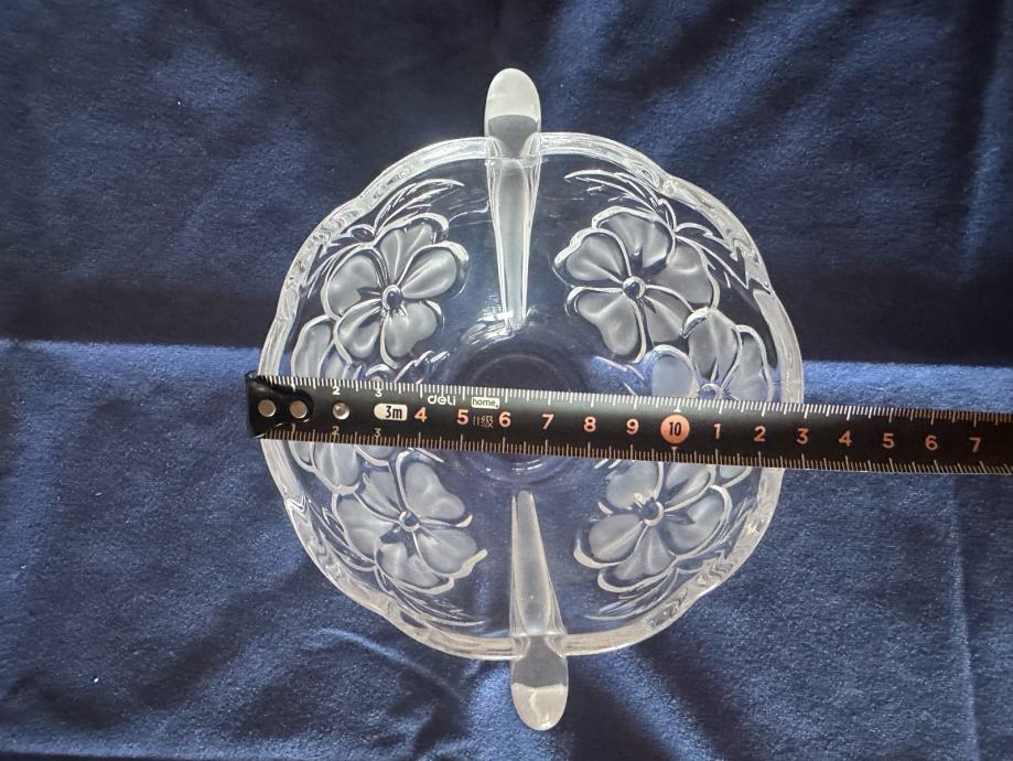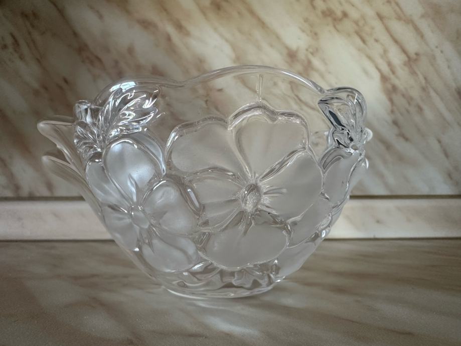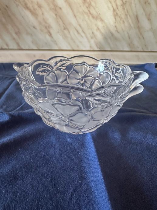 Okrasna posodica iz stekla, nikoli rabljena, v original emblazi.