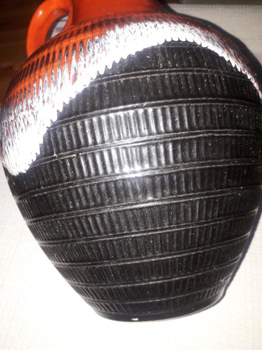 Okrasna vaza višine 35 cm drži vodo, ker je glazirana tudi znotraj. Kvalitetne izdelave, nima praske niti poškodbe. V stanju KOT NOVA. Izdelana začetka 70.-ih let. Obseg 76 cm.
