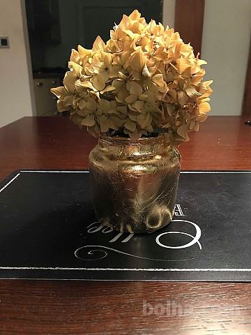 Prodam unikatni vazo obleplejo z zlatimi listici, kar ji daje retro videz. Lahko jo uporabite za sveze ali suho cvetje, lahko tudi za dekorativno posodico v kopalnici,kamor date vatirane blazinice za čiščenje obraza.